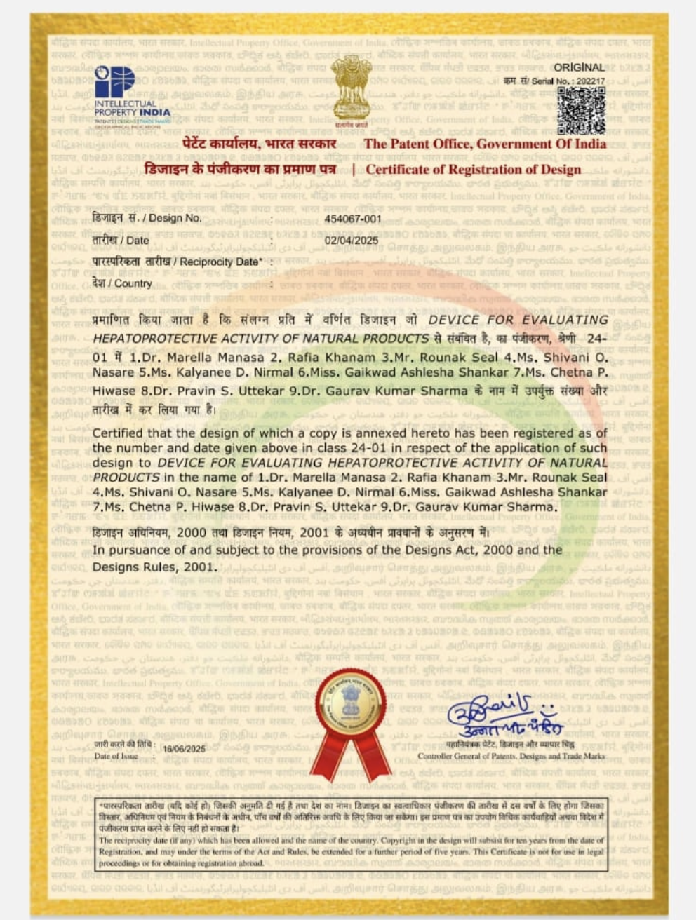 OUR MCPM Books Patents Our Books Patent's 2024-2025 Click here to view the patent Patent's 2025-2026 Certificate of Registration for a UK Design - Apparatus For Encapsulating Phytochemicals In Nanoparticles AI-ENABLED DEVICE FOR DETECTION OF MOTTALING DEFECTS IN TABLET(OCR) Certificate of Registration for a UK Design - Portable Probe Sonicator for Nano formulations of Cancer Certificate - DEVICE FOR EVALUATING HEPATOPROTECTIVE ACTIVITY OF NATURAL PRODUCTS EQUIPMENT FOR PREDICTION OF ANTI- INFLAMMATORY, ANALGESIC AND ANTIOXIDANT ACTIVITY OF EXTRACT